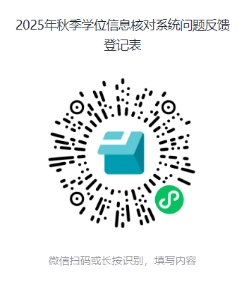 4.核对人如发现“授予数据核对”中信息有误,请暂缓提交,并立即在《2025年秋季学位信息核对系统问题反馈登记表》(附件1)中登记错误信息及申请更正的内容,待学位管理科核实更正后方可提交核对信息。附件1为在线表格,有两种填报方式:① 填报网址:https://f.wps.cn/g/JWrPs4XW/;②微信扫描“2025年秋季学位信息核对系统问题反馈登记表”二维码填报。