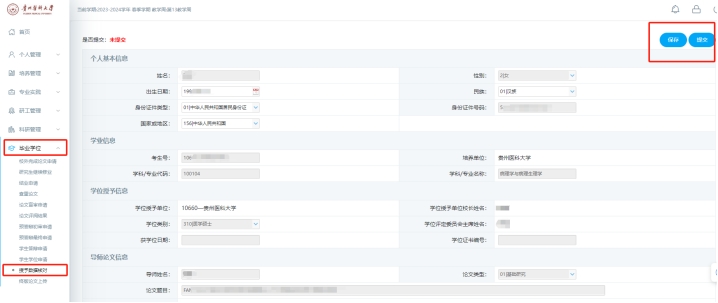 核对人员需登陆“贵州医科大学研究生管理系统(学生端)”,选择“毕业学位-授予数据核对”端口,对系统中的学位信息内容进行逐项核对,核对无误后点击“提交”。操作界面参见下图: